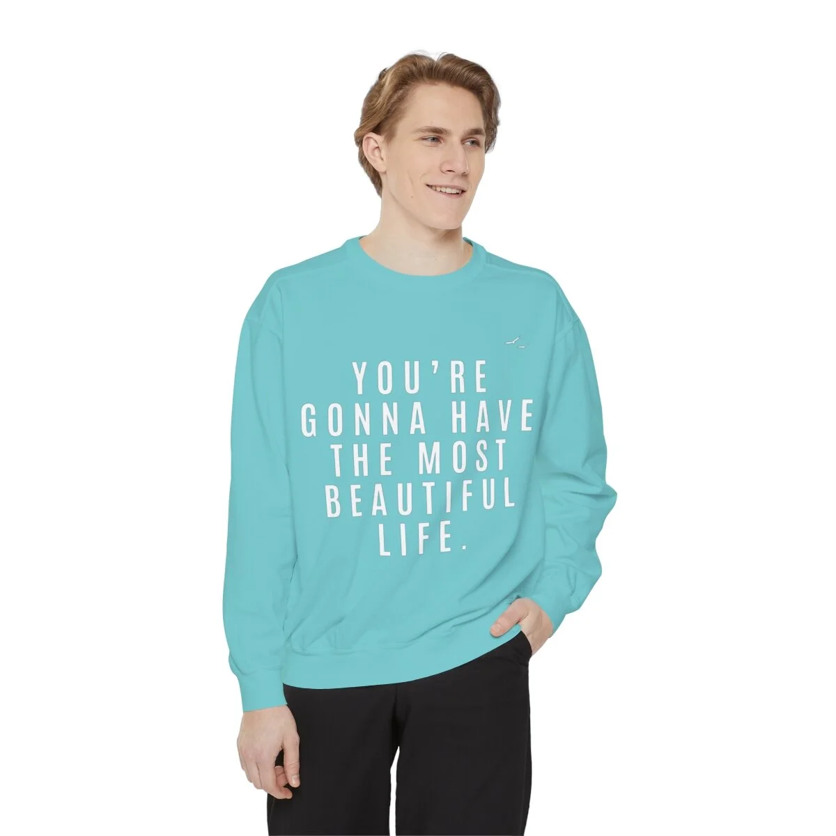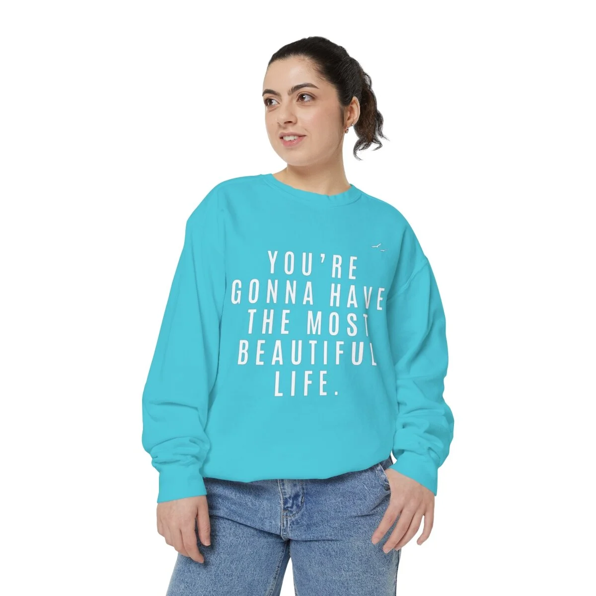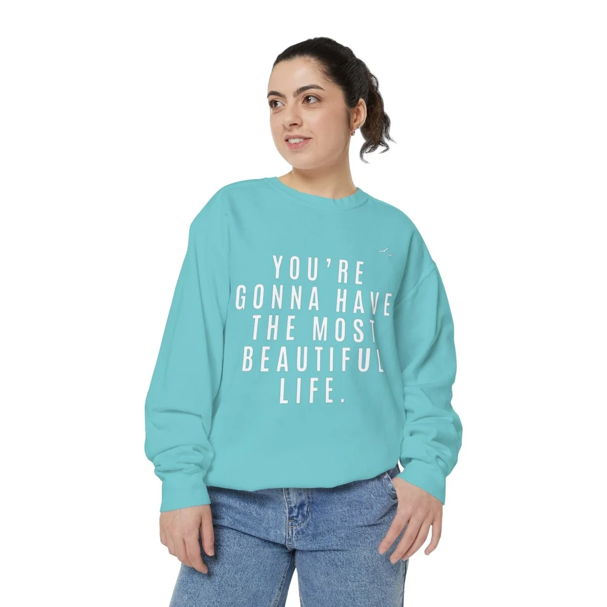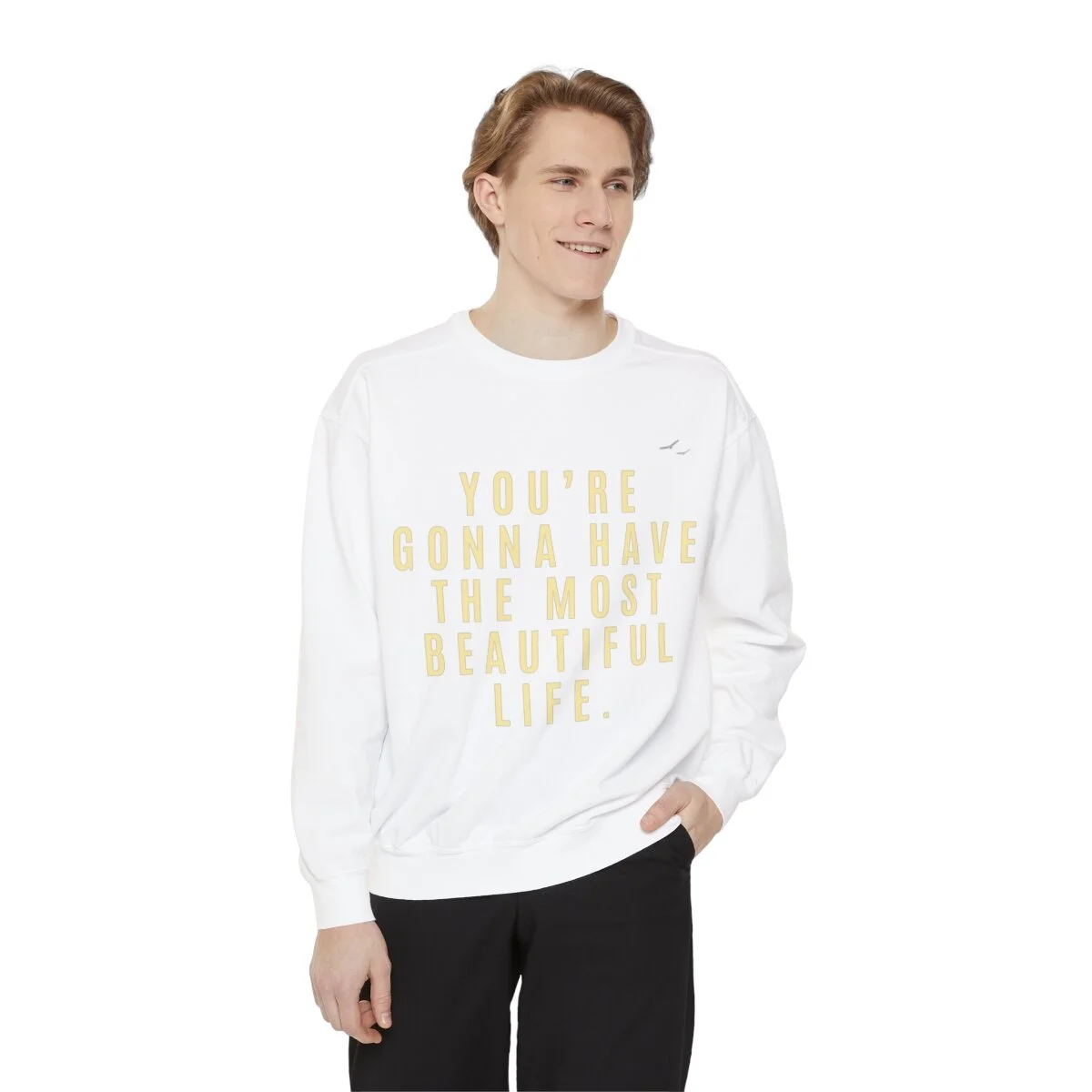 You're gonna have the most beautiful, WARM, life, can you believe it?! If you want to wear this inspiration and inspire anyone who reads it in the process, you're gonna LOVE this shirt! Luxurious comfort and style are what this unisex, garment-dyed sweatshirt is all about. It's made with 80% ring-spun cotton and 20% polyester and the fabric is 3-end garment-dyed, ring-spun, color-blast fleece with a 100% cotton face. Each sweatshirt comes with a relaxed fit, a rolled-forward shoulder, and a back neck patch.