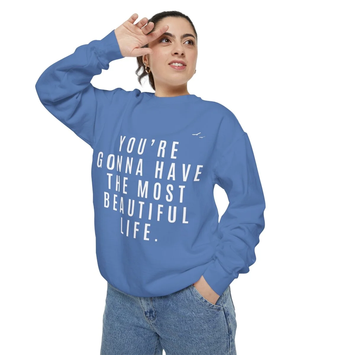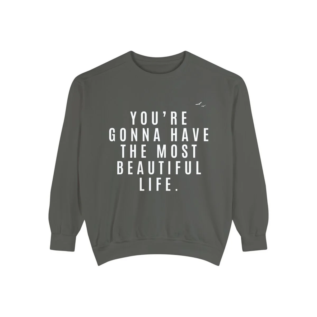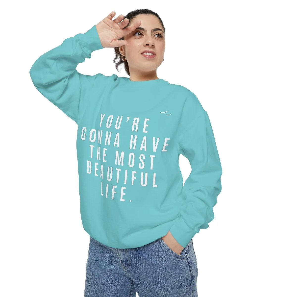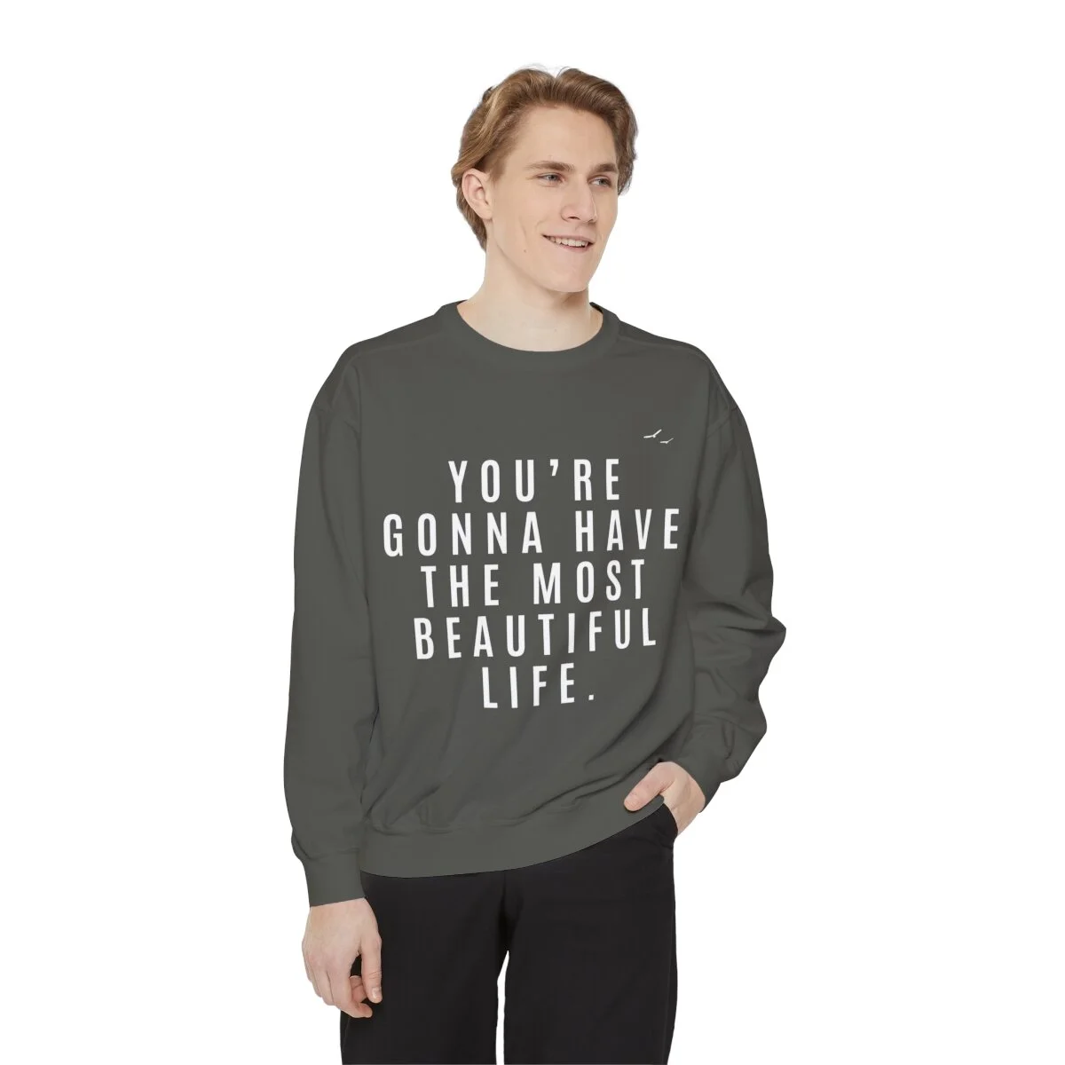 You're gonna have the most beautiful, WARM, life, can you believe it?! If you want to wear this inspiration and inspire anyone who reads it in the process, you're gonna LOVE this shirt! Luxurious comfort and style are what this unisex, garment-dyed sweatshirt is all about. It's made with 80% ring-spun cotton and 20% polyester and the fabric is 3-end garment-dyed, ring-spun, color-blast fleece with a 100% cotton face. Each sweatshirt comes with a relaxed fit, a rolled-forward shoulder, and a back neck patch.