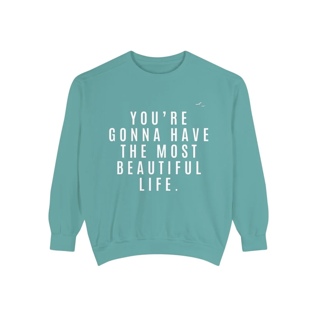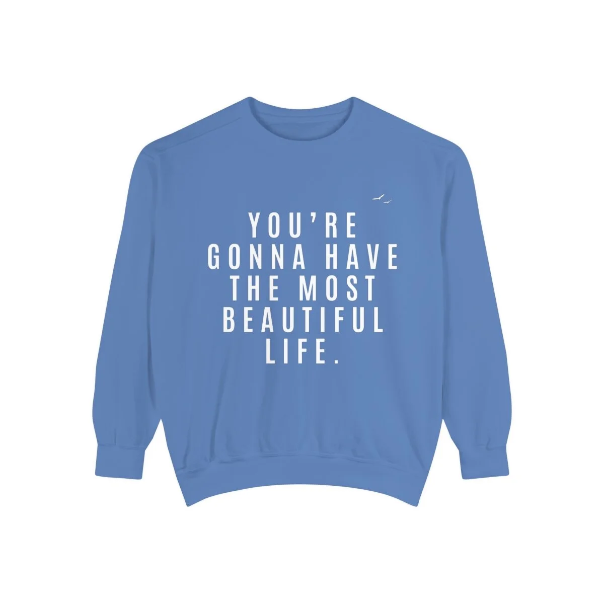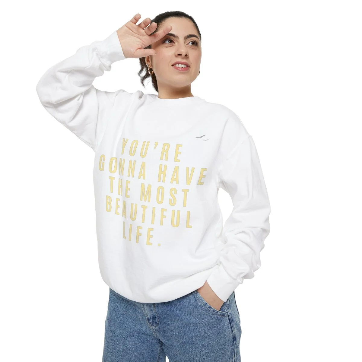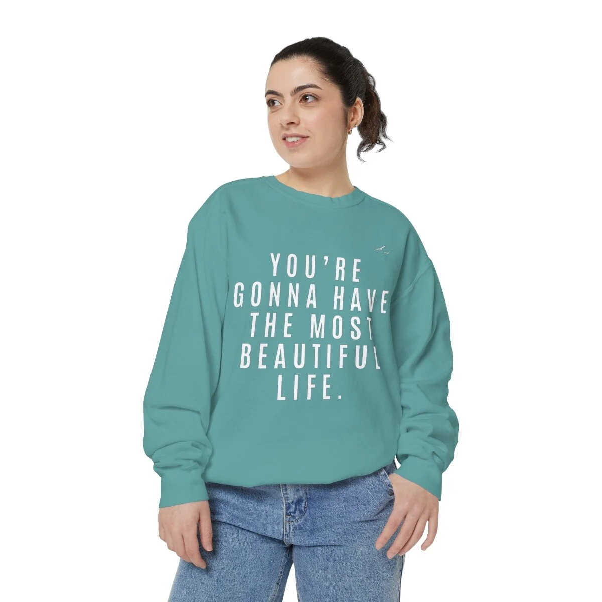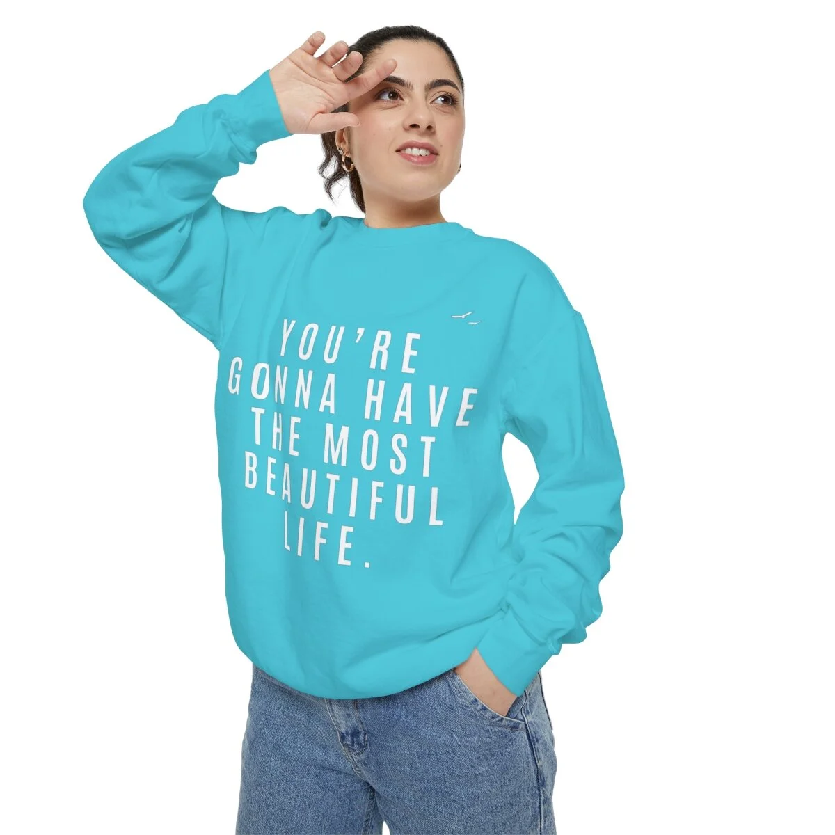 You're gonna have the most beautiful, WARM, life, can you believe it?! If you want to wear this inspiration and inspire anyone who reads it in the process, you're gonna LOVE this shirt! Luxurious comfort and style are what this unisex, garment-dyed sweatshirt is all about. It's made with 80% ring-spun cotton and 20% polyester and the fabric is 3-end garment-dyed, ring-spun, color-blast fleece with a 100% cotton face. Each sweatshirt comes with a relaxed fit, a rolled-forward shoulder, and a back neck patch.