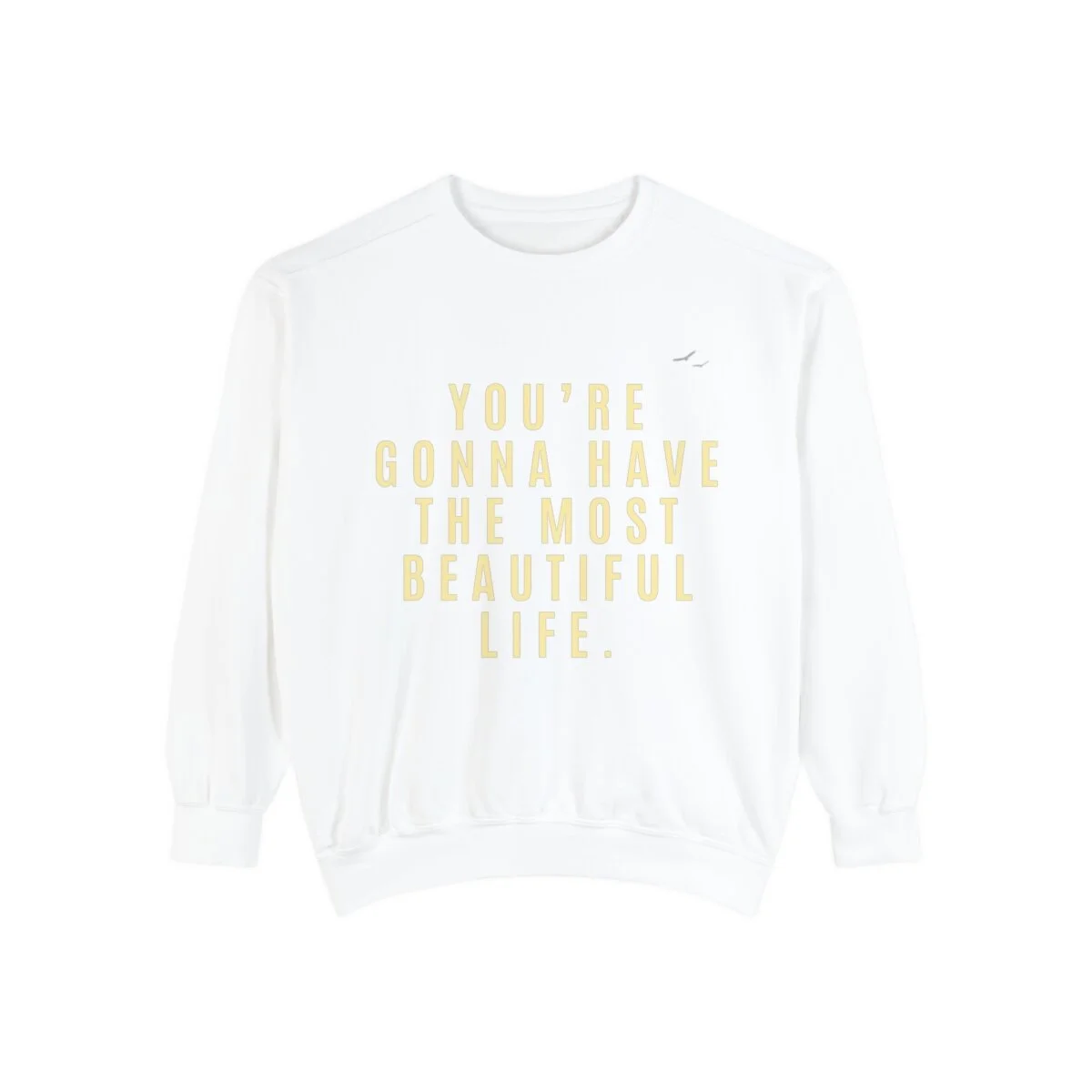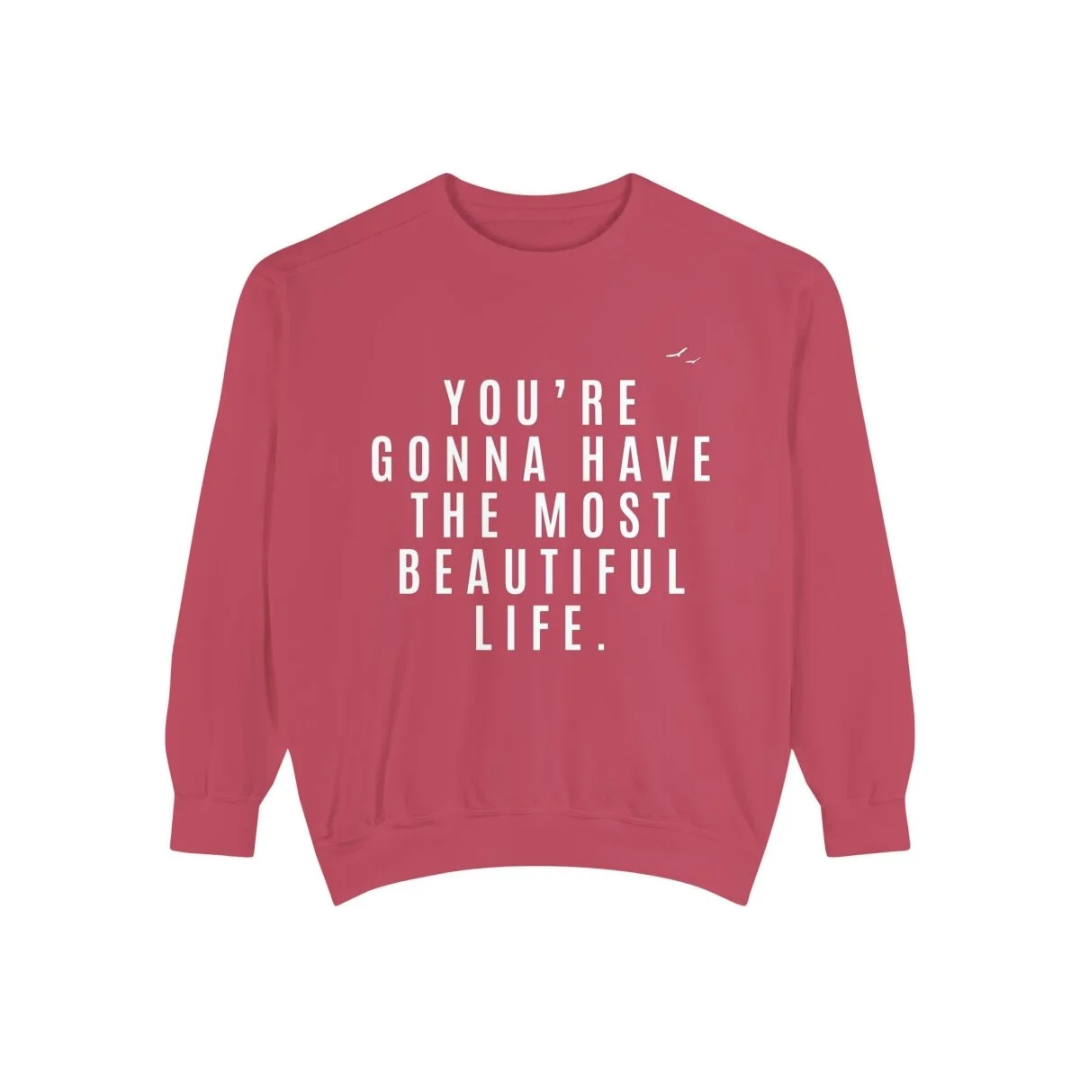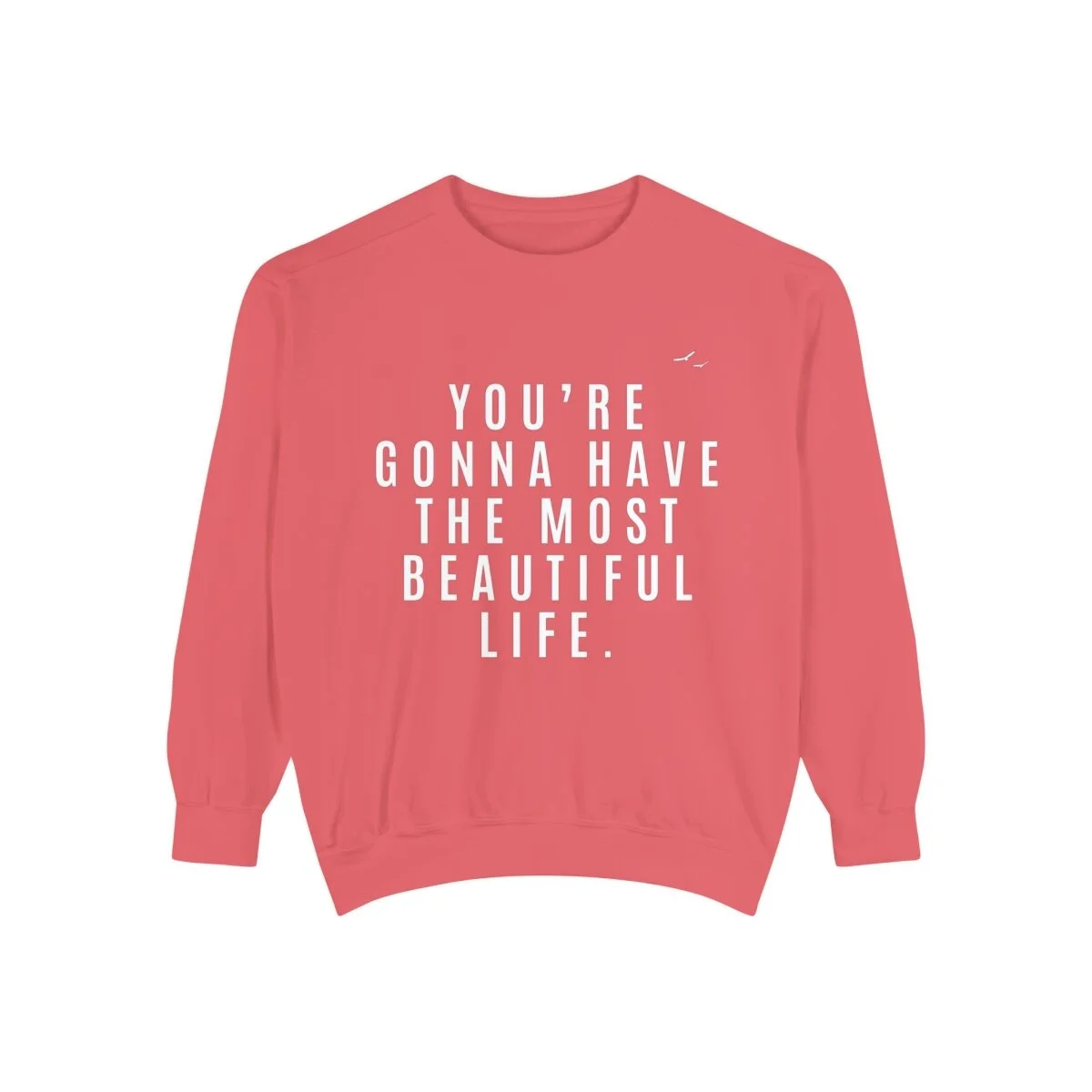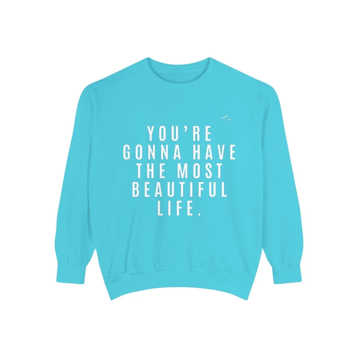 You're gonna have the most beautiful, WARM, life, can you believe it?! If you want to wear this inspiration and inspire anyone who reads it in the process, you're gonna LOVE this shirt! Luxurious comfort and style are what this unisex, garment-dyed sweatshirt is all about. It's made with 80% ring-spun cotton and 20% polyester and the fabric is 3-end garment-dyed, ring-spun, color-blast fleece with a 100% cotton face. Each sweatshirt comes with a relaxed fit, a rolled-forward shoulder, and a back neck patch.